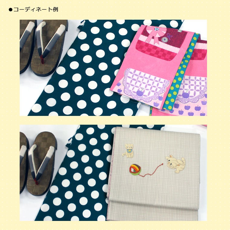 柄 水玉 帯はコーディネートサンプル。 ・古くからある水玉柄を少し大きくして おべべやオリジナルで染めました。 ・きものには珍しい、ビビットな色です。 ・素材は、発色のいいポリちりめんで しっかりとしています。
