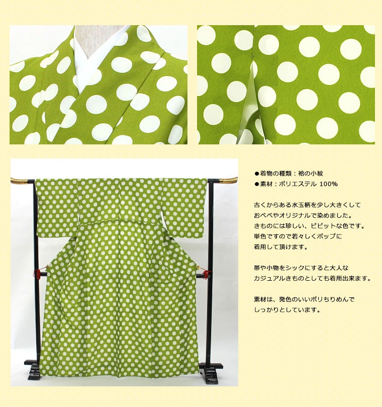 柄 水玉 帯はコーディネートサンプル。 ・古くからある水玉柄を少し大きくして おべべやオリジナルで染めました。 ・きものには珍しい、ビビットな色です。 ・素材は、発色のいいポリちりめんで しっかりとしています。