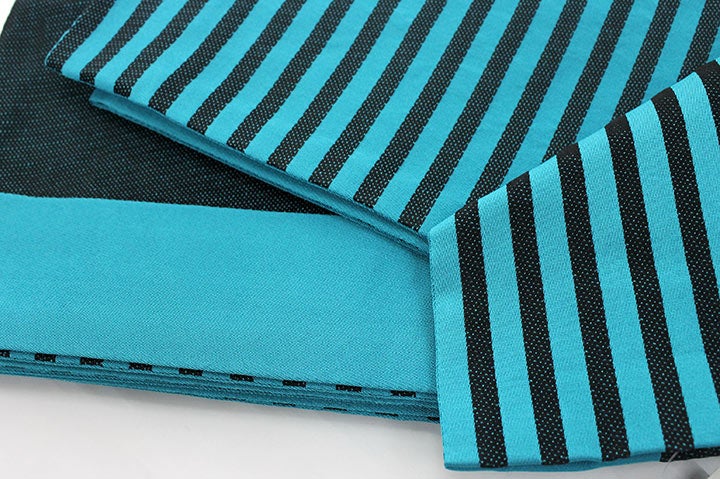 表は中心でブロック柄が切り替わり、裏はストライプとボーダーで切り替わっています。