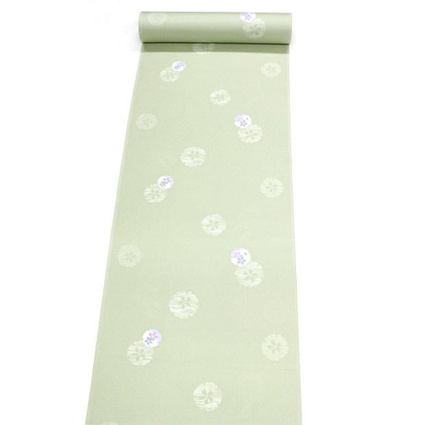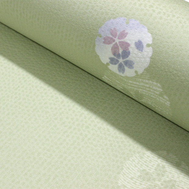 【ワンランク上のお仕立て付き価格】紋意匠生地 若草色/雪輪に桜