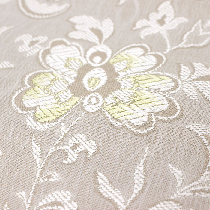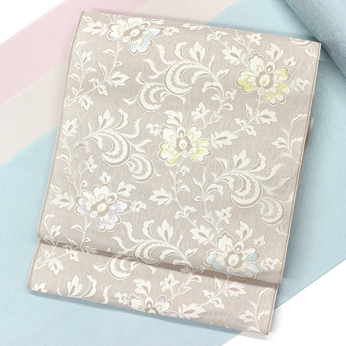 正装からおしゃれ着まで幅広く利用出来ます。 正絹・名古屋帯【お仕立付き】薄茶色 唐花唐草 透かし織り 弥栄 nagoyaobi-127【小紋・色無地向け】【おしゃれ帯】【お茶席】帯芯付・お仕立て代サービス【送料無料】