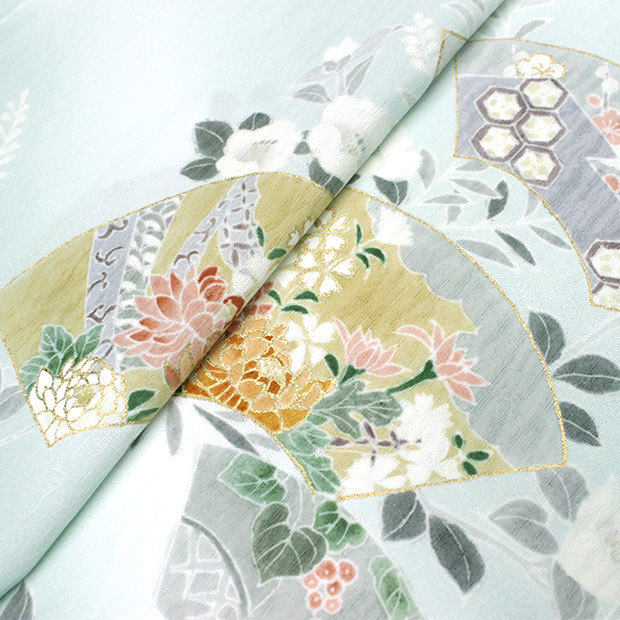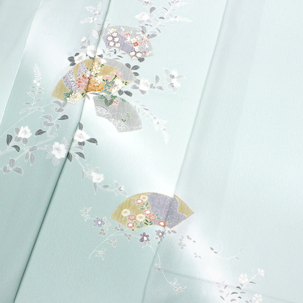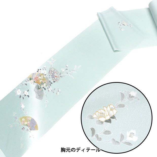手描き本友禅【奏美】青磁色 扇面に椿